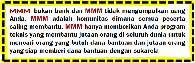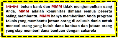Penjelasan di bawah berikut ini bukanlah peraturan-peraturan seperti yang sering kita temui (hanya sekedar mengingatkan anda bahwa di dalam sistem MMM tidak ada peraturan-peraturan seperti yang akan kita temui di badan-badan keuangan lainnya!).